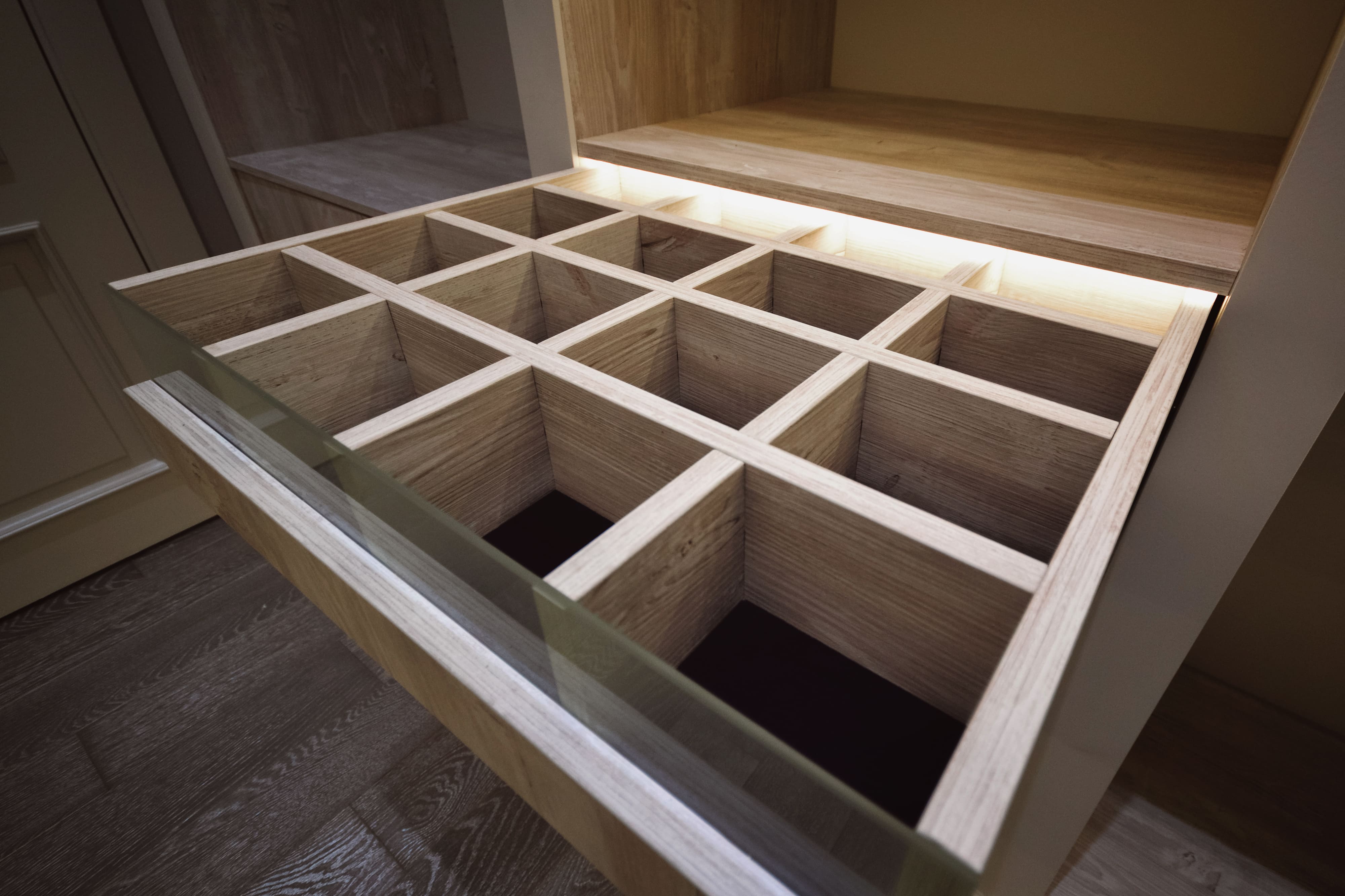 - Светодиодные ленты в выдвижных ящиках — включаются автоматически при выдвижении