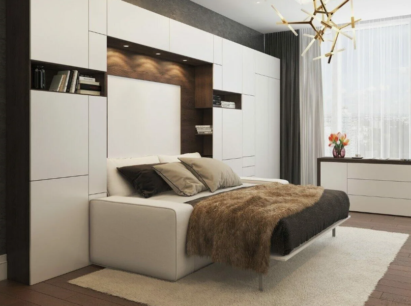Шкафы-кровати представляют радикальное решение для малогабаритных квартир. Днем полноценная двуспальная кровать скрывается в шкафу, освобождая пространство для других занятий. Современные модели оснащаются пневматическими амортизаторами, делающими трансформацию легкой и безопасной.