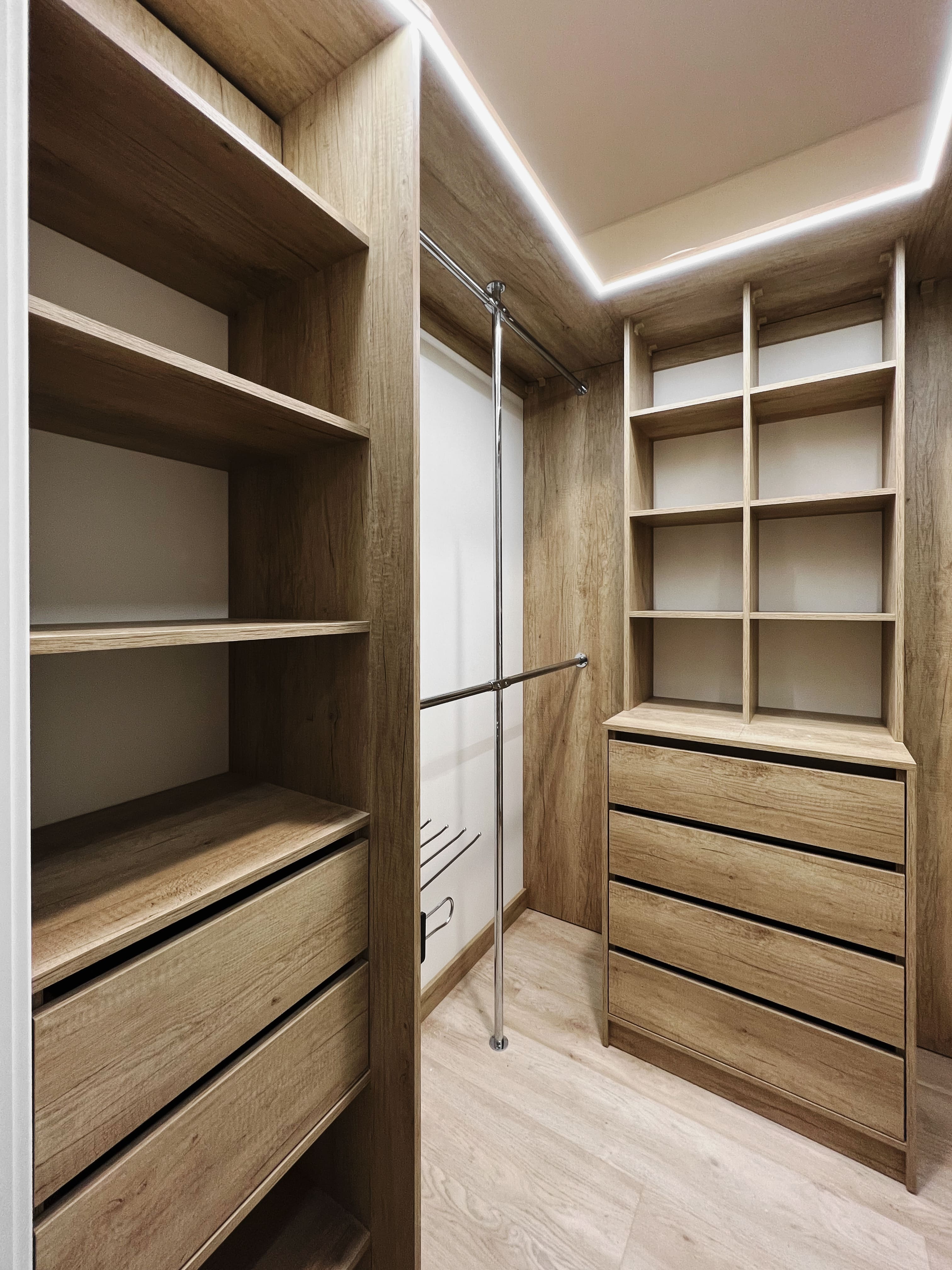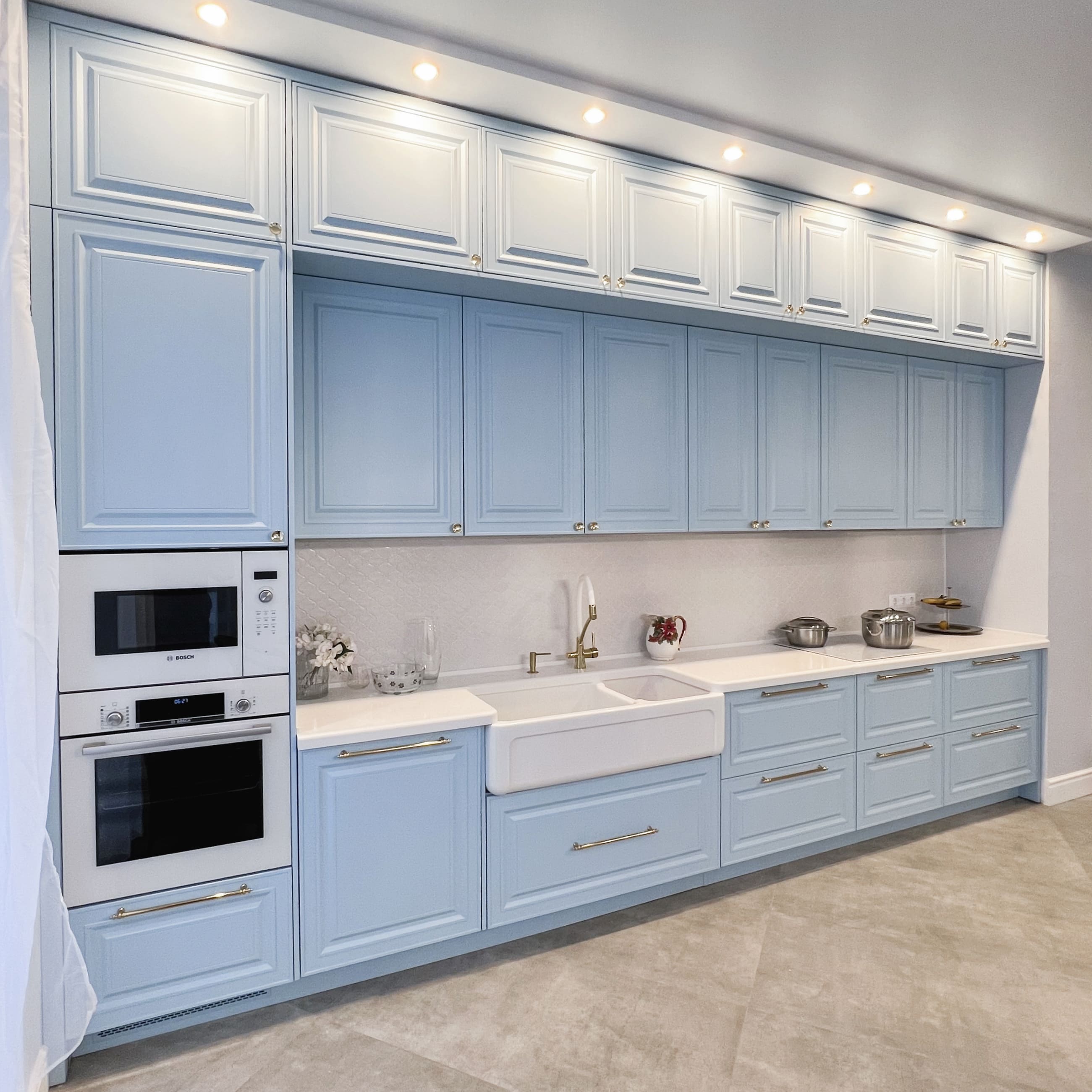 - Важно учитывать высоту помещения. При стандартном размере листа МДФ 2,8 метра и цоколе 10 см, оптимальная высота шкафов составляет 2,2-2,4 метра для удобного доступа. Верхние секции лучше использовать для сезонного хранения.
